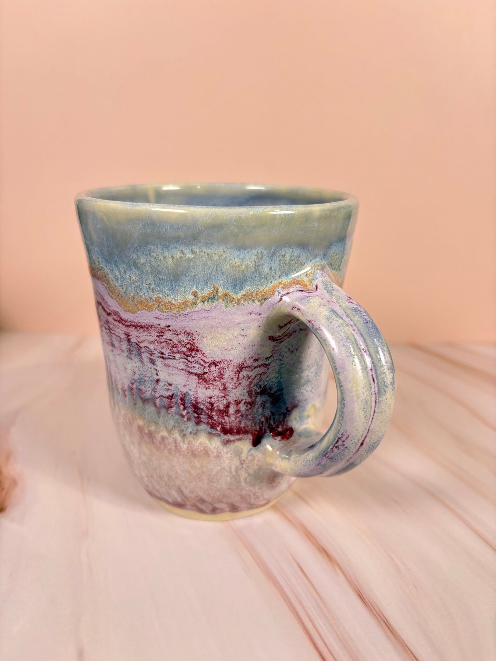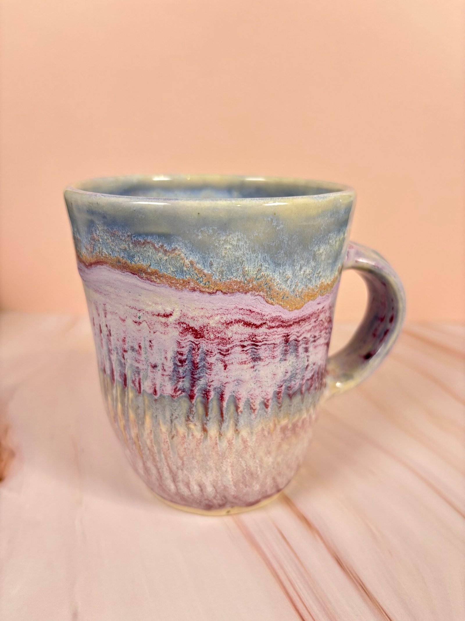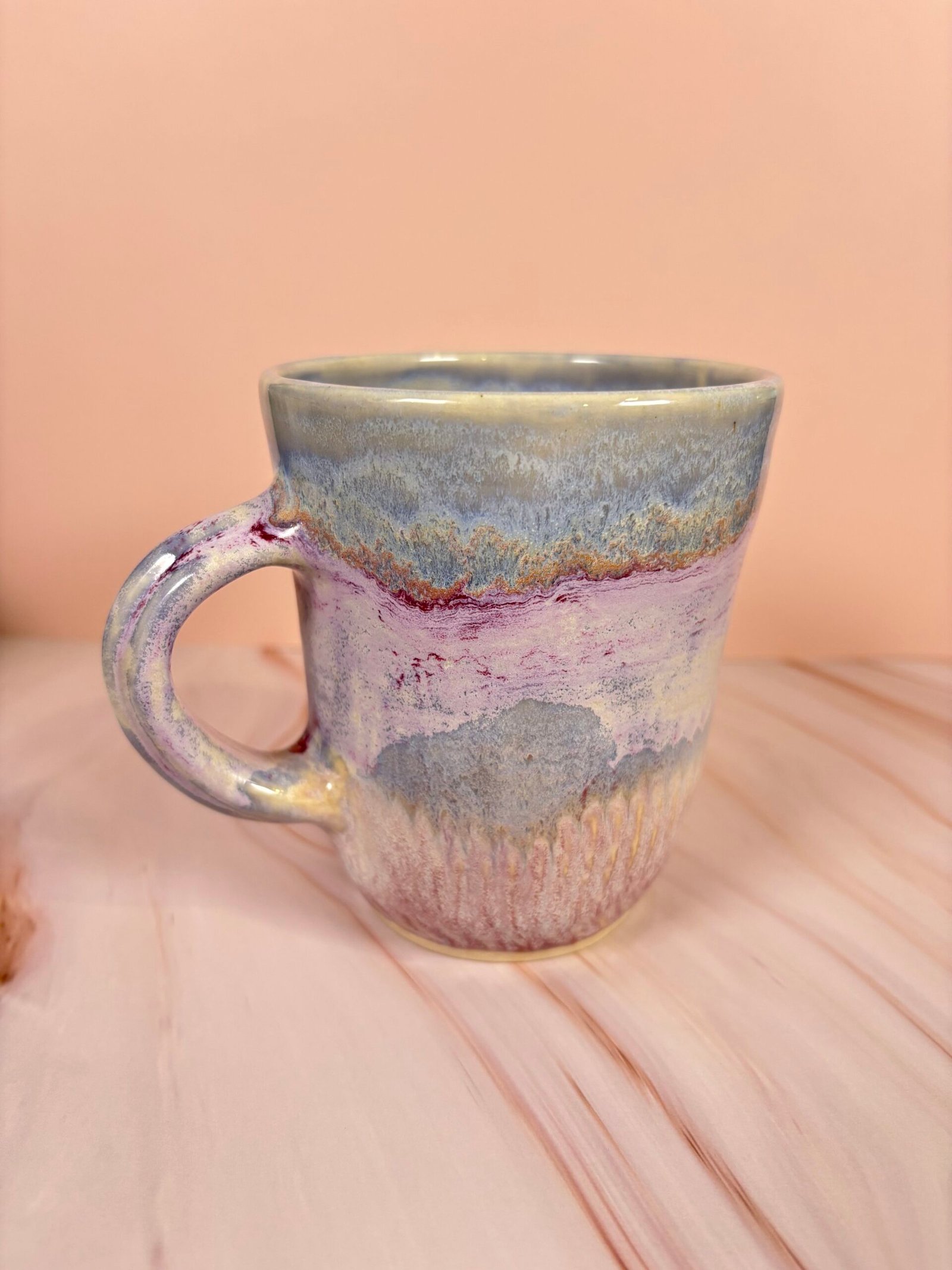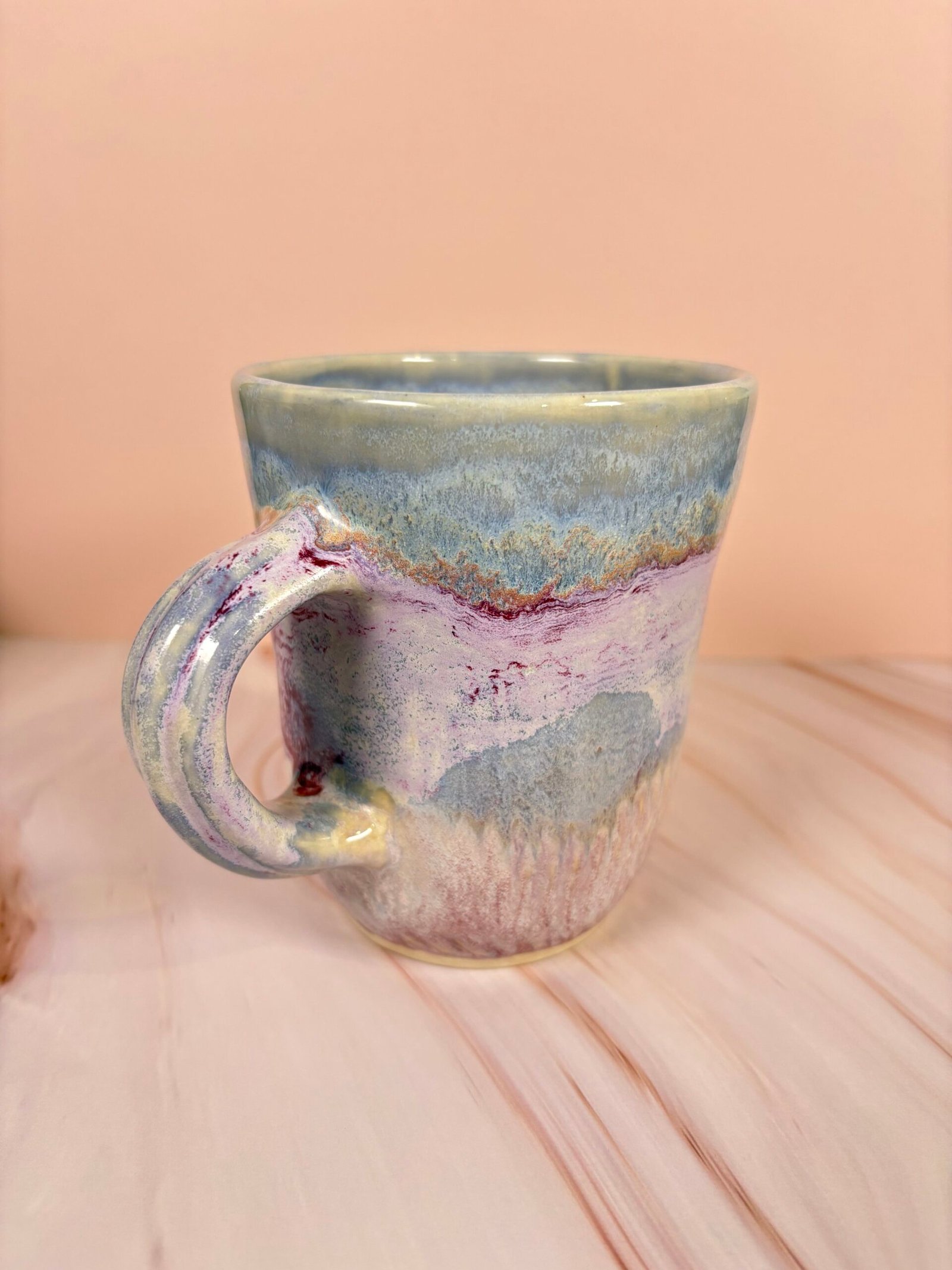Featuring a unique glaze combination with stripes of blues, purples, and creams with both glossy and matte sections, this mug is as beautiful as it is functional! Each piece is uniquely designed, adding a touch of whimsy to your drinkware collection.