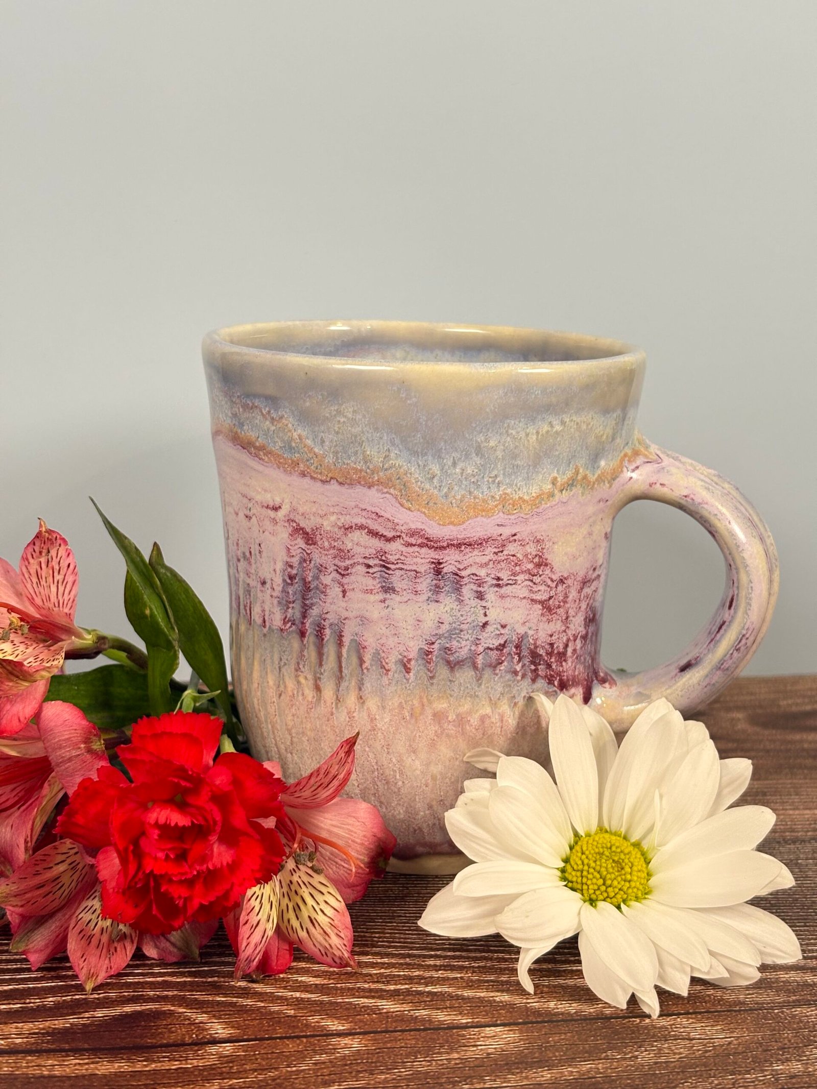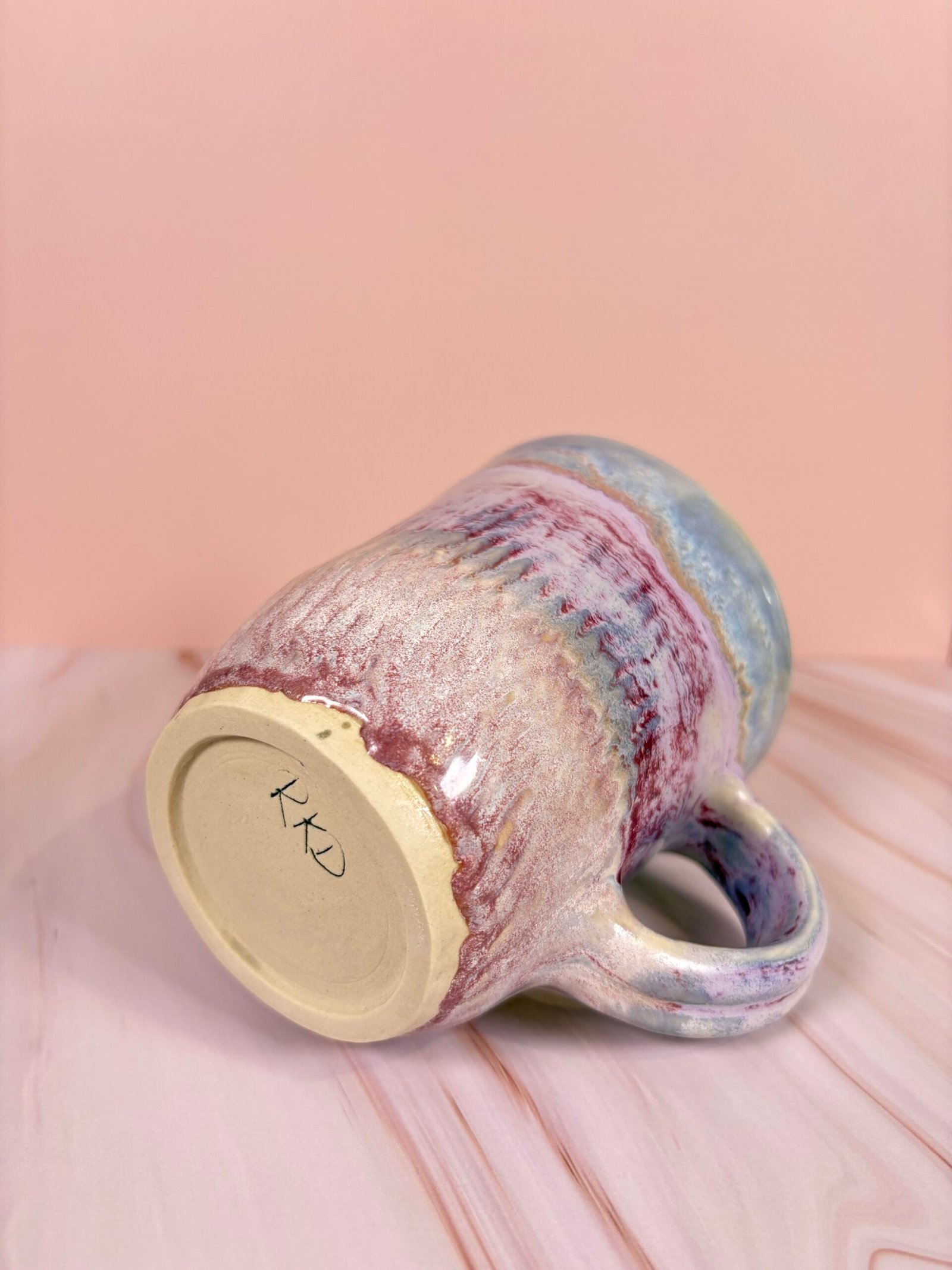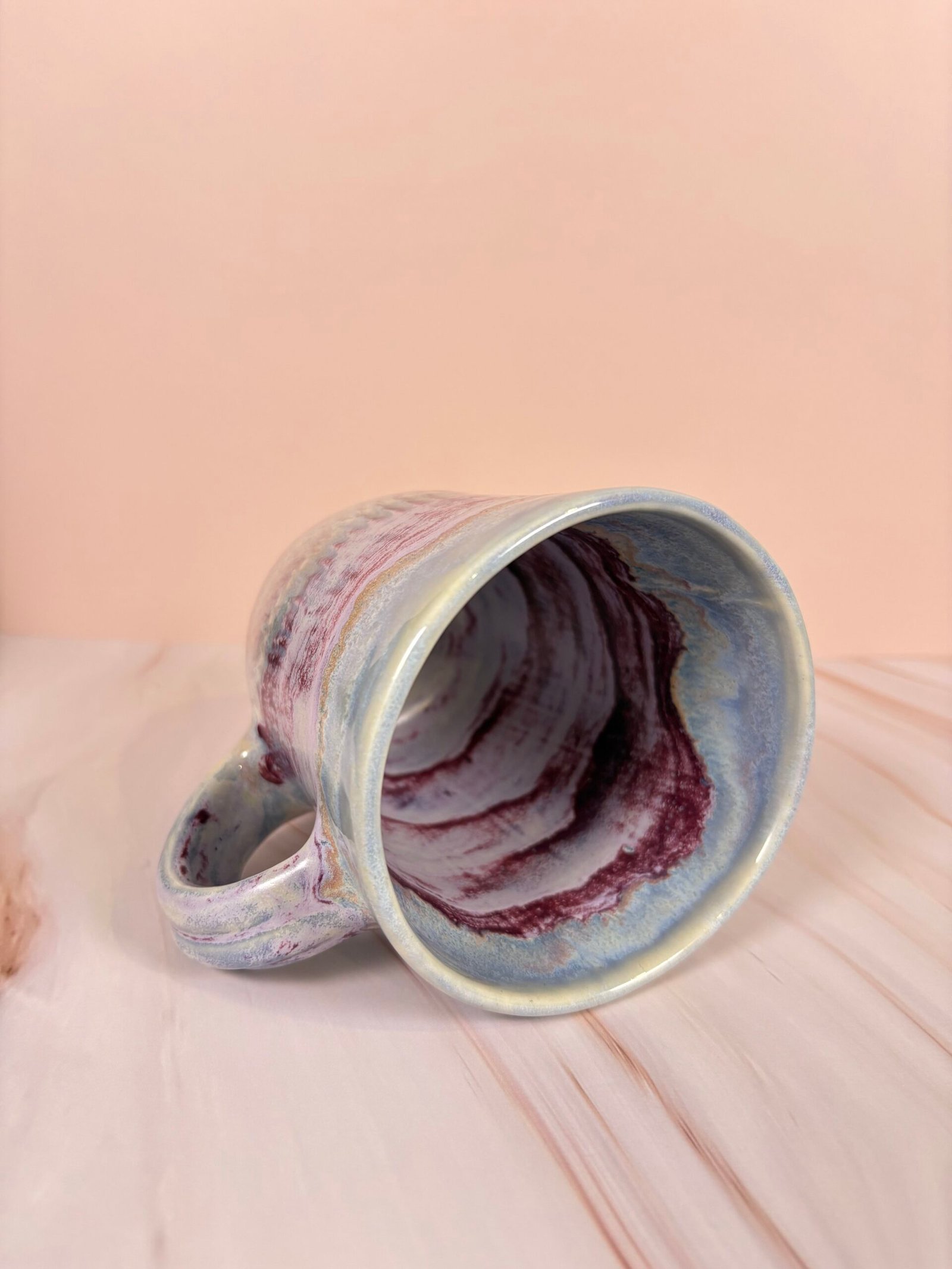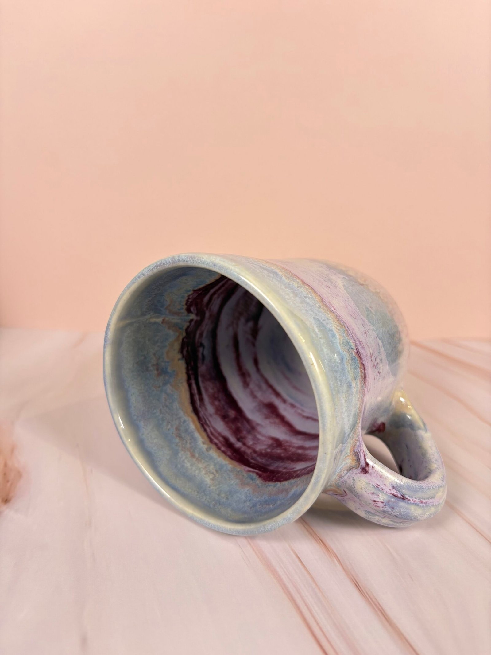 Featuring a unique glaze combination with stripes of blues, purples, and creams with both glossy and matte sections, this mug is as beautiful as it is functional! Each piece is uniquely designed, adding a touch of whimsy to your drinkware collection.
